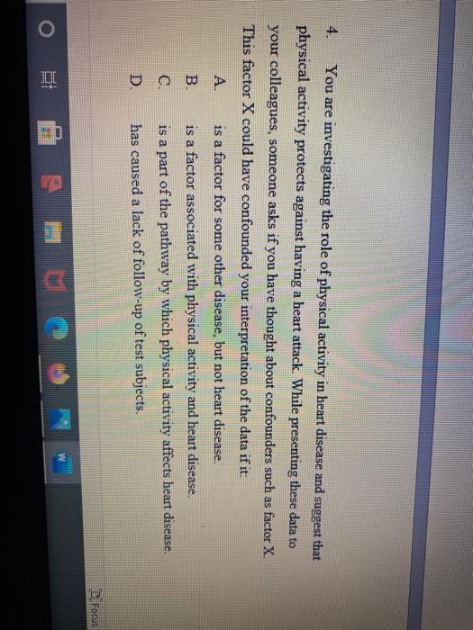 Q7 You are investigating the role of physical activity in heart disease and from CHLH 274 at University of Illinois Urbana Champaign. We now know that people who take up regular physical activity after an initial cardiac event such as a heart attack and who have stable disease symptoms have a 31 lower risk of experiencing another fatal cardiac event - when compared to those people who dont engage in regular physical. This factor X could have confounded your interpretation of the data if it.