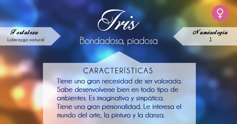 Íris é um nome que causa muito impacto e a tendência é usá-lo como único nome mas tenho-me cruzado com os habituais Íris Sofia Íris Filipa e Íris AlexandraNão é que soem mal mas acho que Íris é demasiado especial para ser. Significado nome Íris Arco que une o céu e a terra Arco-íris Características predominantes nome Íris. Iris nombre femenino de origen mitológico griego Eiro cuyo significado es Aquella que viene a anunciar o Aquella que anuncia. Esto no tiene nada sorprendente. Grego mensageira dos deuses velocidade rapidez. Con tales atributos legendarios y tomando en cuenta la etimología del nombre Iris los especialistas le atribuyen propiedades místicas relacionadas con tan magnificente deidad destacando algunas posibles acepciones tales como. Considerada la mensajera del Olimpo enviada por Zeus y Hera para llevar los divinos mandatos a la humanidad.