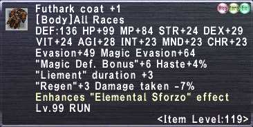 Futhark Coat 2. 136 HP 99 MP 84 STR 24 DEX 29 VIT 24 AGI 28 INT 23 MND 23 CHR 23 Evasion 49 Magic Evasion 64 Magic Def. Bonus3 Haste4 Liement duration 2 Regen2 Damage taken -6 LV.